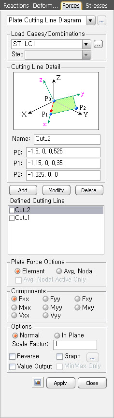 1) Plate Forces/Moments¿¡¼ Plate Force OptionÀÇ 'Local'À» ¼±ÅÃÇÑ ÈÄ Cutting DiagramÀÇ 'Cutting Line'À» ½ÇÇà½ÃŲ °æ¿ì