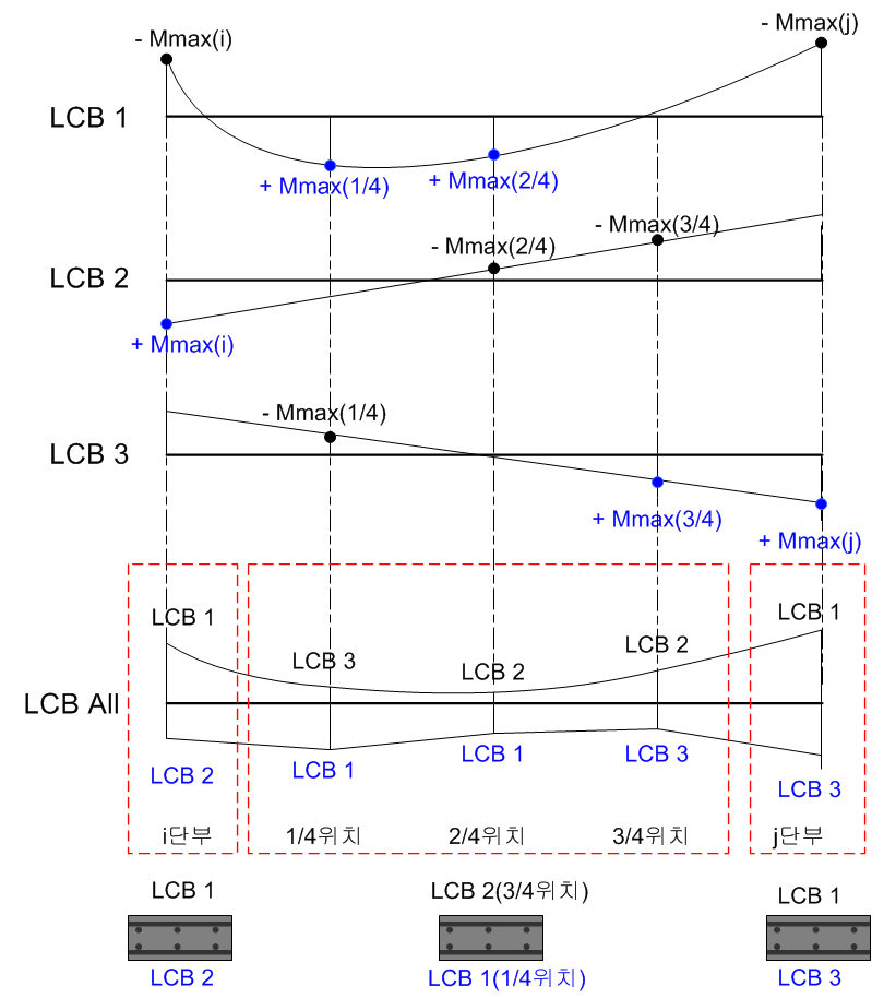 Load Case/Combination Load Case 또는 Load Combination을 선택합니다. 우측의 버튼을 클릭하여 Load Combination창을 호출할 수 있습니다. Avg. Nodal : 절점별로 해당 절점을 공유하는 요소의 절점내력을 평균한 내력을 적용하여 자동설계한 결과를 출력합니다. Element : i, 1/4, 2/4, 3/4, j위치에서 요소들에 발생된 설계부재력을 계산하여 출력합니다.
