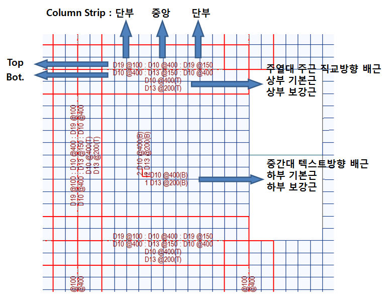 Column Strip 주근 배근방향 직각방향 상부철근(기본근 및 보강근)