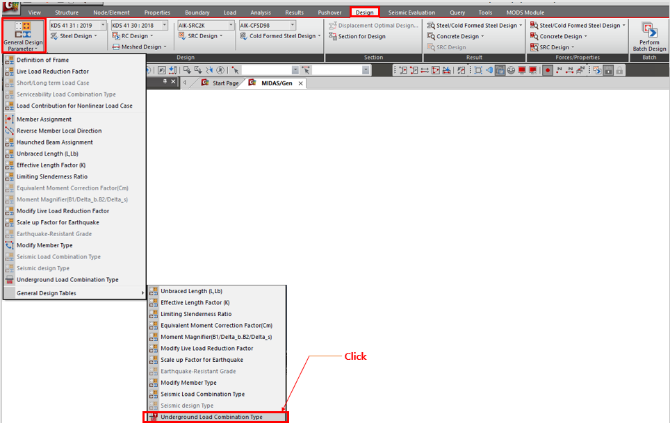 [Design] 탭 > [General Design Parameter] > [Underground Load Combination Type]