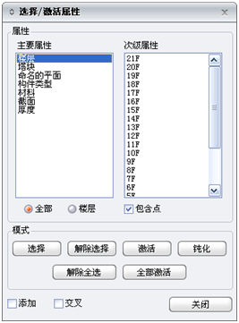 "主要属性"包括楼层、标准层、塔块、命名的平面、组、构件类型、材料、截面、厚度。"次级属性"为模型中所定义的主要属性的内容。用户按照"次级属性"的分类来进行选择或激活。