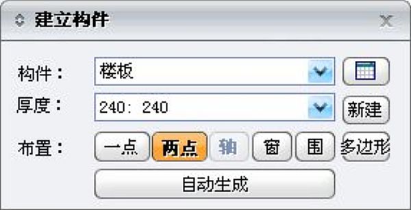 (1)选择构件:楼板 (2)选择楼板厚度 (3)选择布置方式:两点 (4)点选楼板对角线的起点和终点。