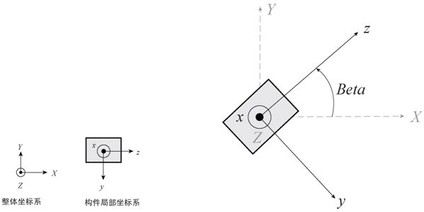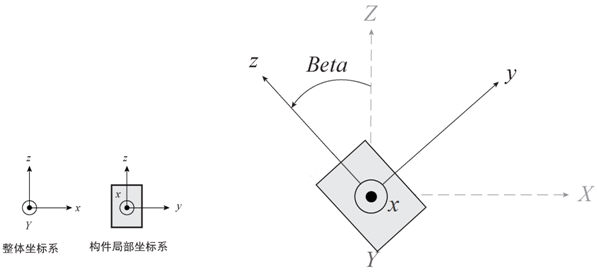 (2)Beta角:为便于用户使用软件,引入了构件Beta角的概念:对于竖向柱构件,Beta角为构件局部坐标系的z轴与整体坐标系X轴的夹角,如图4.3.6-2所示;对于水平向布置的梁构件,Beta角为构件局部坐标系z轴与整体坐标系Z轴的夹角,如图4.3.6-3所示;