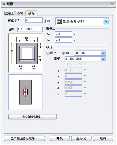用户可通过此对话框定义组合截面号、名称、截面尺寸等信息; 程序提供矩形-箱形-开口、矩形-管形-开口等14种组合截面;定义组合截面时,用户需分别定义混凝土和钢材的截面数据。