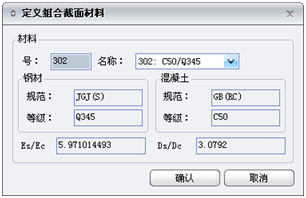 (1)定义组合材料:点击弹出组合材料特性对话框,显示组合截面的钢材和混凝土的材料特性。