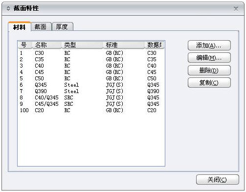 添加:定义一个新的材料类型、截面形状或厚度特性。将截面特性对话框切换到材料、截面、厚度,分别弹出材料、截面、厚度定义对话框。