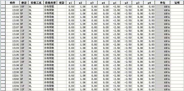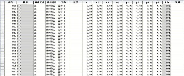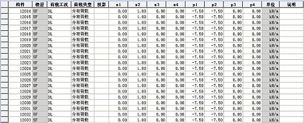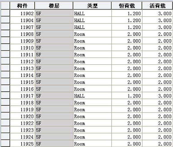 以表格形式显示楼板荷载值,可以查看和编辑表格中的荷载。表格中只列出了通过菜单 荷载>构件荷载>楼板定义的楼板荷载,而在定义楼层和标准层时定义的楼板荷载不予列出。