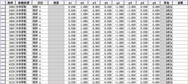 以表格形式显示线荷载值,可以查看和编辑表格中的荷载。表格中的参数”r;投影”、”r;x1”、”r;x2”、”r;x3”、”r;x4”、”r;p1”、”r;p2”、”r;p3”、”r;p4”含义可参见第6.2.2节。