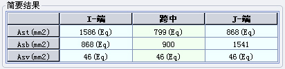 根据截面、设计、内力信息计算得到一般梁构件I-端、跨中、J端的上部筋Ast、下部筋Asb和箍筋Asv。带(Eq)标志的配筋面积为考虑地震的控制工况计算所得。