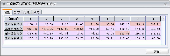 查看各荷载组合的内力结果:查看“荷载组合”中所选工况类型的构件详细内力结果,每个梁进行8等分,显示每个分点处的弯矩、剪力、扭矩和轴力,包络值以亮红色突出显示。