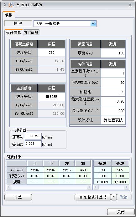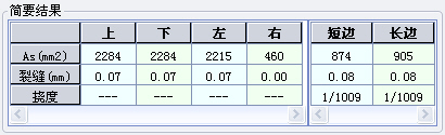 根据设计、内力信息计算得到上下左右四个支座的钢筋面积、裂缝宽度及楼板长短边方向的分布筋、裂缝宽度和挠度。 以上对一般构件的UMD工具箱作了简单介绍,程序对于特殊构件也能进行同样的设计和验算,这里不再一一赘述。