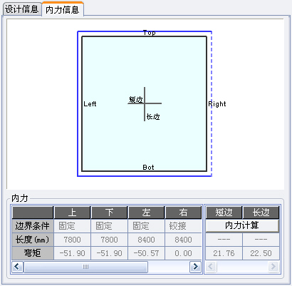 该对话框布置与一般梁基本相似,本节只对差异部分加以介绍,其它信息参见第7.9.1节。 (1)设计信息:若构件为从图7.9对话框中传递过来的构件,程序自动显示混凝土信息、钢筋信息、荷载和一些设计参数;若为新建构件,则由用户自行定义。 (2)内力信息:若构件为从图7.9对话框中传递过来的构件,将自动显示楼板上下左右的边界条件、长度、支座弯矩值及楼板长短边内力值;若为新建构件,则由用户自行定义。