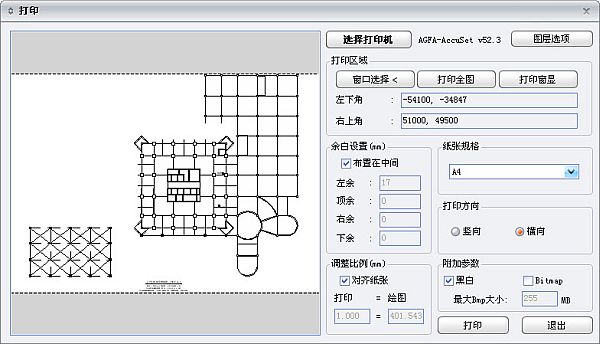 ②打印:点击该选项,弹出下图对话框,设置打印机、图层选项、打印区域、余白设置、纸张规格、打印方向、调整比例及附加参数等选项后,点击 可直接打印当前图形结果文件