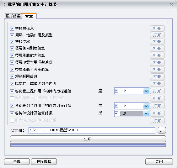 ①生成:点击该选项,自动在保存路径下生成所选各文本结果文件,自动以模型名称和文本类型名称命名;生成完后可点击各文本结果后 按钮,直接查看结果; ②全选:选择全部文本结果; ③解除选择:解除选择全部文本结果;