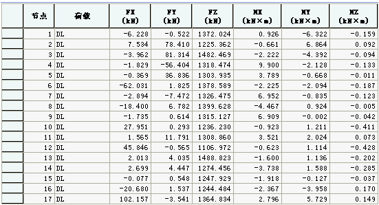 反力结果表格:表中列出了所选节点在相应荷载工况或荷载组合下反力的六个分量(图8.2.1-3);也可通过主菜单>结果>结构分析结果下的图标 查看表格; |