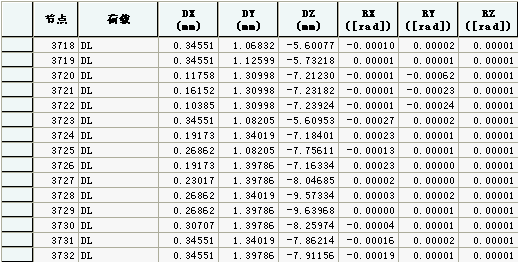 (1)位移表格:点击位移后面的 按钮,将以表格方式输出图8.2.2-2中所选节点在相应荷载工况或荷载组合下的六个分量位移结果(图8.2.2-2);也可通过主菜单> 结果> 结构分析结果下的图标 实现该功能;