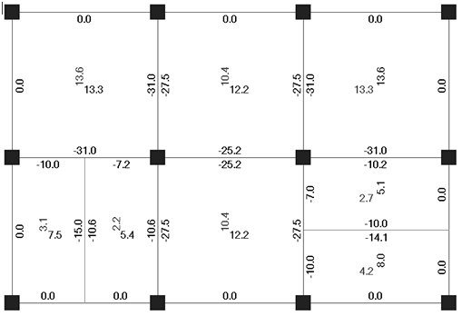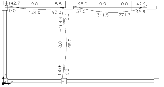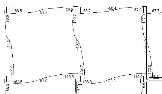通过这项菜单可以以图形方式查看楼板的弯矩包络图。楼板只给出跨中和支座处计算截面的弯矩,负值表示负弯矩、正值表示正弯矩。