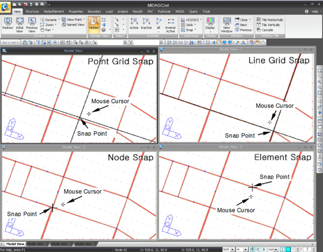 From the Main Menu select View > Grid/Snap > Snap > Point. From the Main Menu select View > Grid/Snap > Snap > Line. From the Main Menu select View > Grid/Snap > Snap > Node. From the Main Menu select View > Grid/Snap > Snap > Element. From the Main Menu select View > Grid/Snap > Snap > All. From the Main Menu select View > Grid/Snap > Snap > Free. |