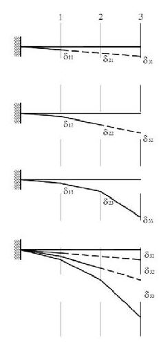 Note Real displacement is relevant only for construction stage analysis. To illustrate real displacement, a cantilever is constructed in 3 stages as shown below. Node 3 is activated at the stage 3, and the deflection δ33 occurs due to the self weight of the segment 3. But when constructing steel girders or PC girders, the virtual displacements δ31 and δ32 occur at the stage 1 and stage 2 respectively. Real displacement is the summation of virtual displacements, which occur before the corresponding node is even activated and net displacement, which occurs after the node is activated. Real displacement corresponds to the fabrication camber.