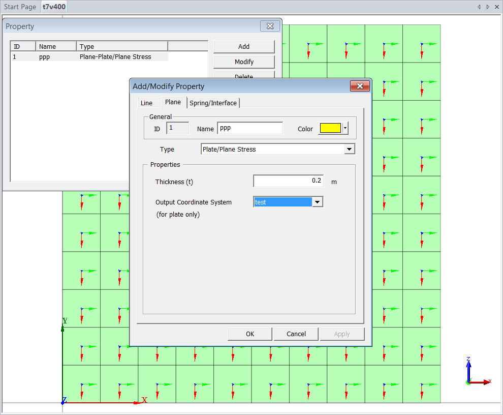 <2> Having defined the UCS in <1> , the plate CS will now be assigned with 3. Call Model > Property > Property. 4. Select the Plate Property and modify the "Output Coordinate System" to display the UCS created in Step 1.