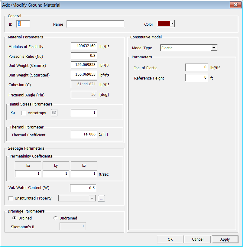parameter for Skempton's B Coefficient. Constitutive Model Select