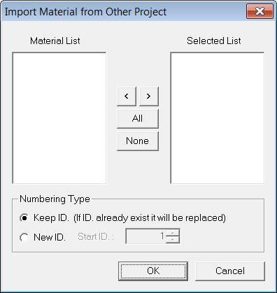 Material data to be imported and register the data in the Selected List. Numbering Type of Material Specify the Import mode for material property numbers. Keep ID Import