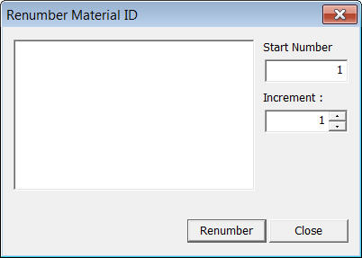 the increment for numbering Material numbers. Change element's material number Modify a material property number. Using this option will modify the previously defined material property number. If this option is not checked, the selected material having previously defined number will become undefined and the additional user-defined material number will be created without any assigned elements. |