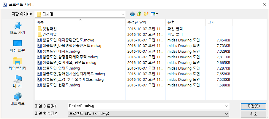 midas Drawing 파일 저장 단위는 프로젝트 단위로 저장되며, mdwg 파일 형태로 저장 됩니다. 단, MIDAS Drawing 프로젝트의 경우 도면 생성모드는 삭제되고 전환되므로 주의가 필요합니다. (생성한 도면을 캐드모드에서 배치한 경우 캐드모드의 도면은 작업한 그대로 저장됩니다.)