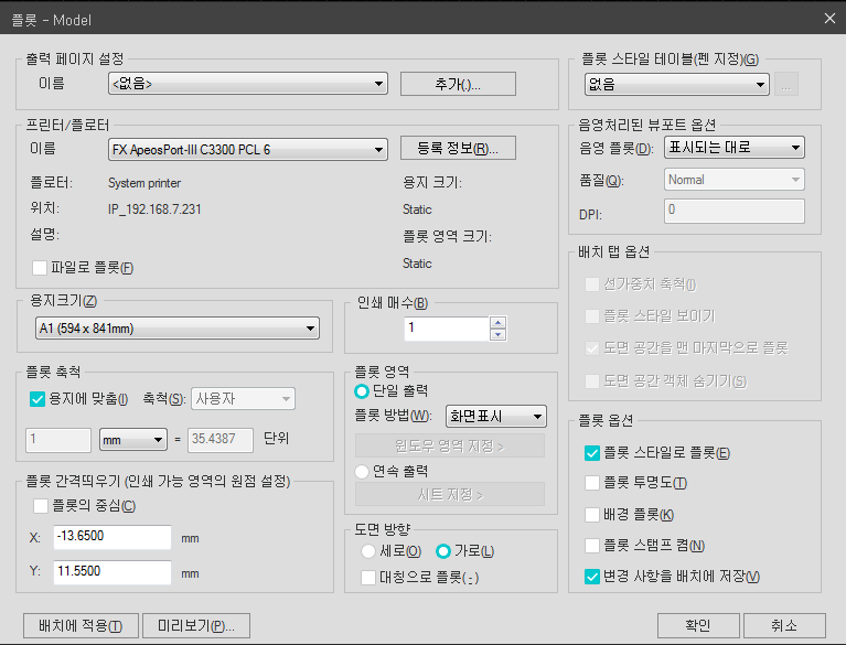 플롯 스타일 관리자          출력 페이지 설정 관리자          플롯 미리보기          옵션