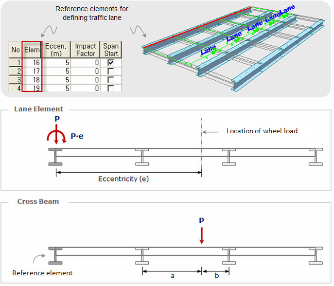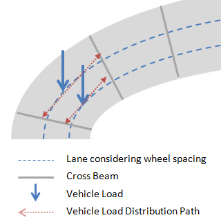 When defining the lanes with lane element type, the vertical load components (vehicle loads) and the moment due to eccentricity is assigned only on the line lane element. Even though the lanes can be located on cross beam elements, if the lane element type is selected, then the distribution effect for the cross beam analysis will not be considered.
