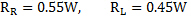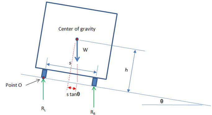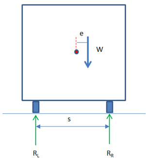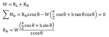 The wheel load reactions, RL and RR are calculated by summing moments about Point O and enforcing equilibrium.