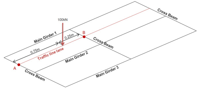 For example, an axle load of 100kN is located as shown below. Then, concentrated loads, 25kN and 75kN, are applied to point A and point B respectively. The cross beams themselves are loaded. The smaller spacing between cross beams gives the more correct results for the moving load analysis.