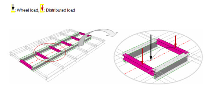 Cross Beam Group: Specify the name of the Structure Group to which Cross Beams are assigned. A wheel load is distributed to adjacent cross beams as shown below.