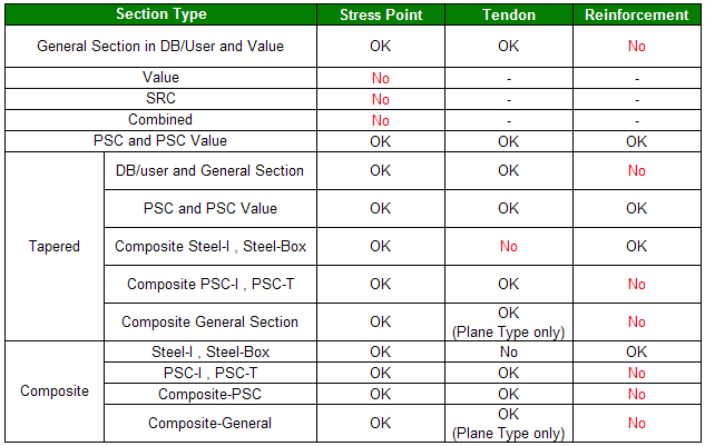 The results produced in the Diagram and the Table can be different from those of Beam Detail Analysis since the moment of inertia can be different depending on the way of applying the axis (local direction). (Refer to Note 1. In Beam Detail Analysis, the section properties at the positions (1/4, 1/2 & 3/4) are re-calculated using the section shape information at the corresponding positions whereas in diagrams and tables, section properties at the positions (1/4, 1/2 & 3/4) are obtained by interpolation between i-end and j-end.)
