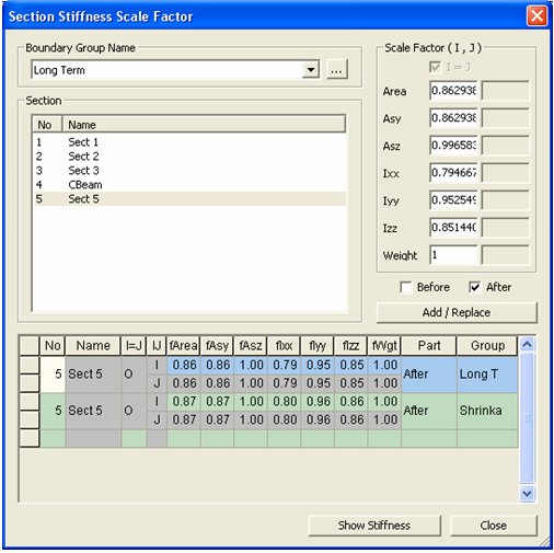 The scale factors defined in "Section Stiffness Scale Factor" are saved as section data and used for each construction stage as well as the final stage.