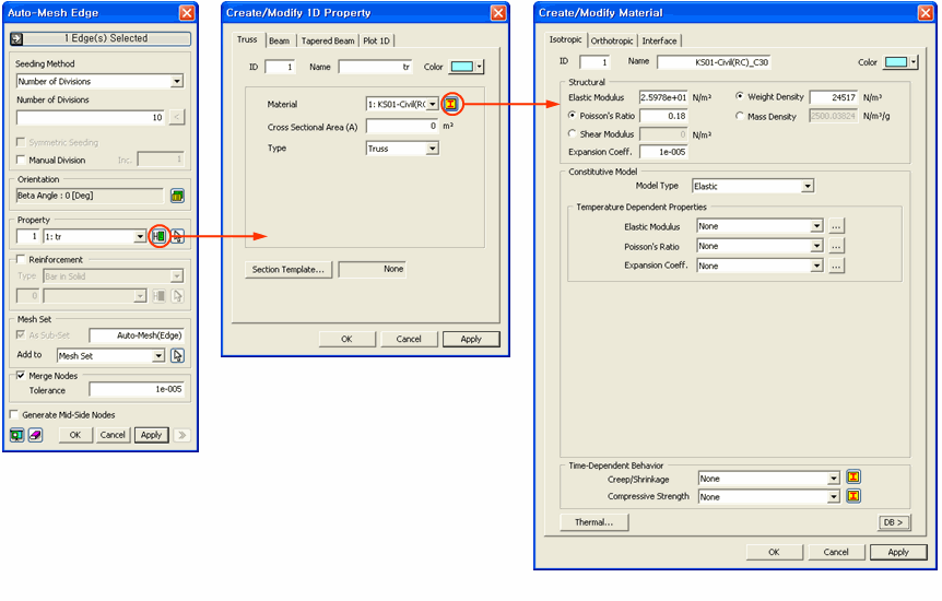 <Example of Dialog Boxes for defining Element, Material, and Property> |