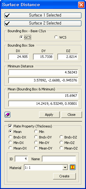 Select Surface 1, 2 Select the desired two surfaces. Bounding Box - Base CSys Measure the distance between two selected surfaces based on the selected coordinate system.