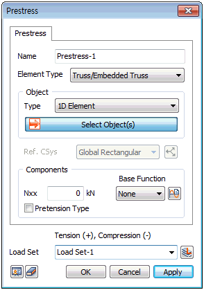Used to input the prestress load. For truss/beam elements, the initial load for axial direction force and moment can be applied. For plane strain elements, axis symmetric elements and solid elements, the initial stress can be defined.