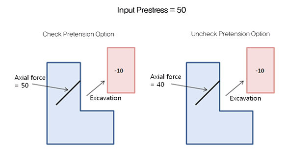 For truss/beam elements, the [Pretension Type] option can be applied. Checking this option maintains the input pretension regardless of the stress state changes that occur in the construction stage. If this option is unchecked, the prestress changes with the input stress state. If a prestress of 50 is input as shown in the figure below, checking [Pretension Type] retains the prestress as the axial force, regardless of the stress change due to excavation. If the pretension is not checked, the axial force is affected by the stress change of 10 due excavation and so, the output axial force is 40. Pretension can only be applied if the prestress is input for a truss element type.