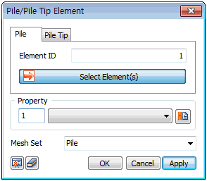 Piles are an interface affiliated element in embedded beam element form that does not require node connections with the neighboring ground. It is used to check the relative displacement and friction behavior between the beam element and the ground. Create a beam element and neighboring ground element and then select the beam element to create a pile element.