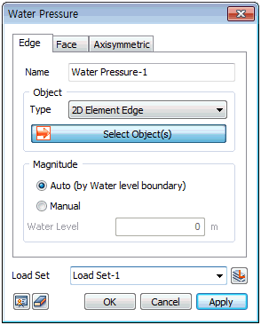 Select the element boundary edge or surface where the water pressure will be applied. The [Auto] option can be used when the water level is pre-set, and it is used to automatically calculate the hydrostatic pressure based on the height difference between the water level and element boundary edge/surface. Use the [Manual] option to directly specify the water pressure size applied on the selected element edge/surface.