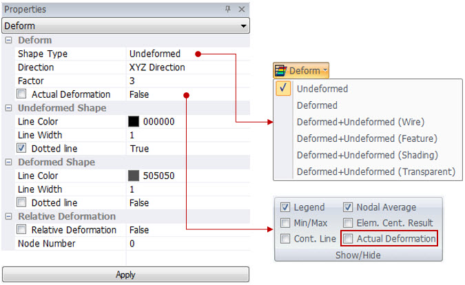 Specify the method used to display both the deformed shape and un-deformed shape simultaneously on the screen. It is used when applying Deformed + Undeformed (Wire) or Deformed + Undeformed (Feature).