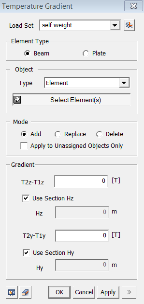 Enter the temperature difference between the top and bottom of beam or plate elements for thermal stress analysis. Modify or delete previously entered temperature difference. Temperature gradient analysis is applicable for elements with bending stiffness, such as beam and plate elements. In the case of a beam element, enter the temperature difference and the corresponding distance between the extremities of the element with respect to the local y and z-axes. In the case of a plate element, the temperature gradient can be represented by the temperature difference between the upper and lower faces of the plate and the plate thickness. The gradient temperature produces equivalent moments.