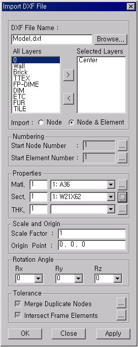 Even in case of element shape errors (e.g., overlapping nodes) during DXF file import, the import can be executed as the program is ignoring the parts with errors. In the message window, the following error messages will display. "[WARNING] Invalid Node(No.XX) is skipped!", "[WARNING] Invalid Element(No.XX) is skipped!"