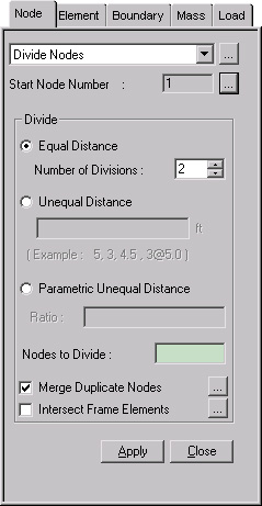Click to the right of Divide Nodes: Display the Node Table Start Node NumberEnter a starting node number for the newly created nodes resulting from the division. This number is auto-set to the largest node number in use +1. To modify this item, click and select an option to specify a desired number. DivideEqual Distance: Divide the line at an equal spacing Number