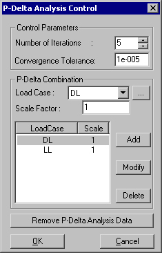 P-Delta CombinationSelect the loads that will be applied to determine the geometric stiffness matrix used in the P-Delta analysis. Enter different Load Cases with the corresponding Scale Factors. Select the dead loads (self-weight, dead load, etc.) generally acting on the structures. |