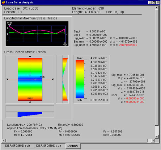 Assign the desired position (on the element's local y-z plane) in the section stress distribution diagram by moving the mouse cursor to the left or right and up or down. In addition, assign the desired position along the length (in the element's local x-axis) by moving the mouse cursor to the left or right in the maximum stress graph.