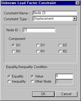 Equality: Condition where the value of the displacement in the load combination that includes the unknown load factors (or the displacement value of the relevant component of another node) is equal to the entered value