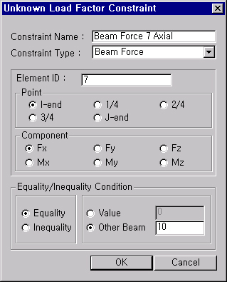 Equality: Condition where the value of the beam element's member force in the load combination that includes the unknown load factors (or the member force value of another beam element) is equal to the entered value