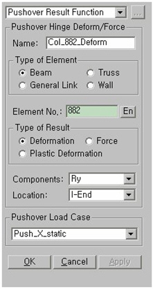 Name : Enter the name of a Graph Function (Pushover Hinge Deform/Force). Type of Element Beam : Select Beam type when pushover hinge type is specified as Beam/Column. Truss : Select Truss type when pushover hinge type is specified as Truss. General Link : Select General Link when pushover hinge type is specified as General Link. Wall : Select Wall when pushover hinge type is specified as Wall element. Element No : Enter the element number, or click in the entry field then select the element from working window. Type of Result Deformation : Total deformation of pushover hinge Force : Member force of an element Plastic Deformation : Plastic deformation of an element (Total deformation of hinge Yield deformation) Note Plastic deformation is displayed as zero before yielding.